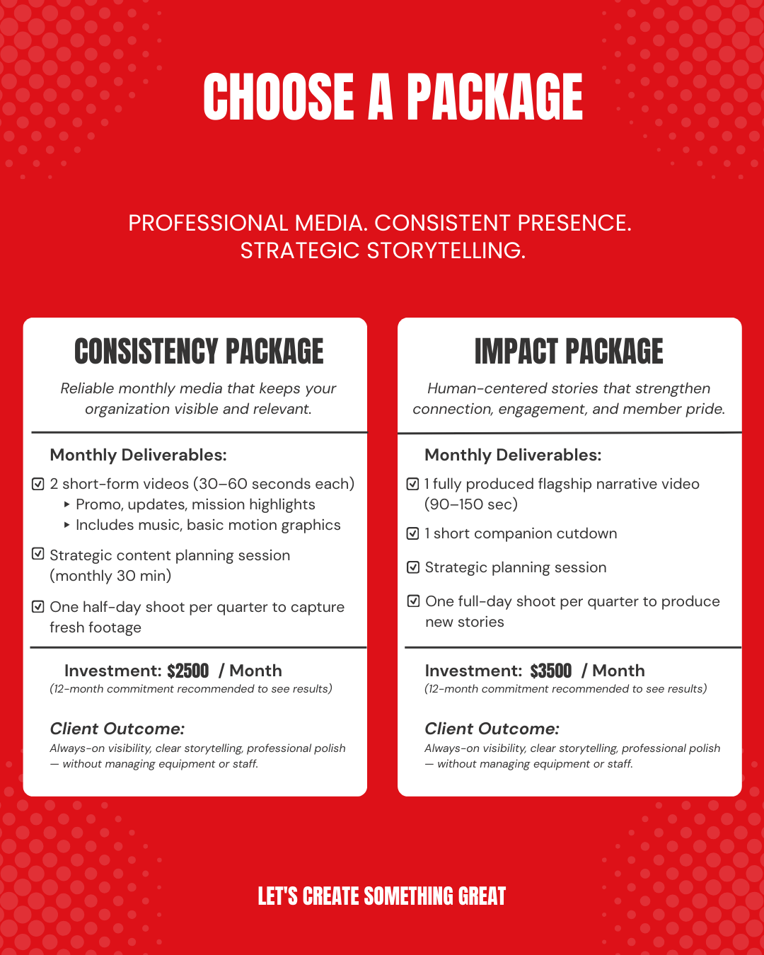 Strategic monthly video production that helps organizations engage their audiences, communicate their value, and maintain a strong, professional presence year-round — without hiring in-house staff.